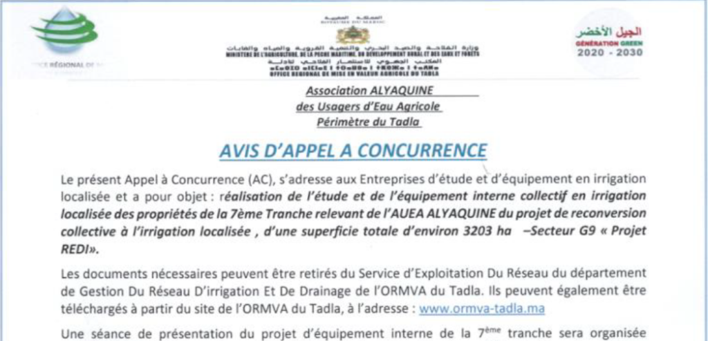 1. Le présent Appel à Concurrence (AC), s’adresse aux Entreprises d’étude et d’équipement en irrigation localisée et a pour objet : réalisation de l’étude et de l’équipement interne collectif en irrigation localisée des propriétés de la 7ème Tranche relevant de l’AUEA ALYAQUINE du projet de reconversion